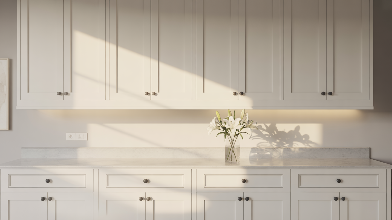 - Wall Paint: Soft greige tones create subtle dimension beyond pure white, providing gentle contrast that highlights cabinetry while maintaining an open, airy environment that feels sophisticated and inviting.