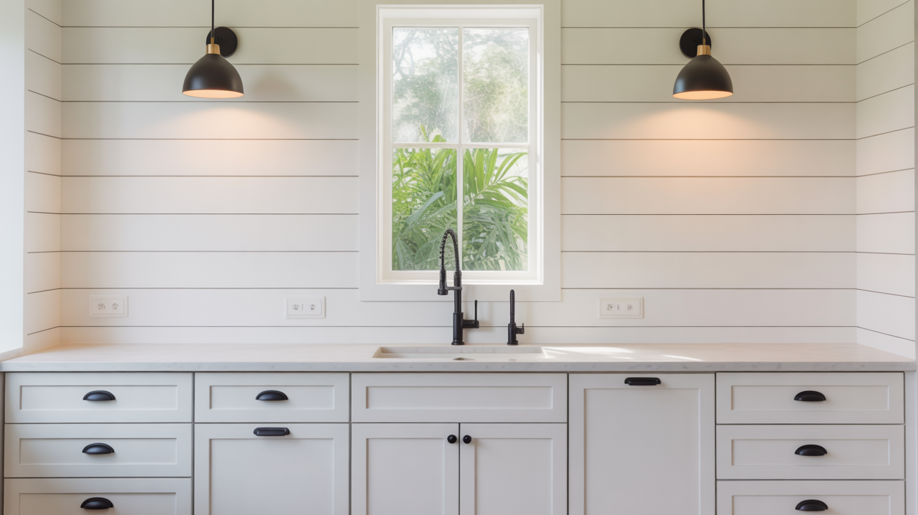 21. Shiplap Walls, White Cabinetry, and Matte Black Hardware