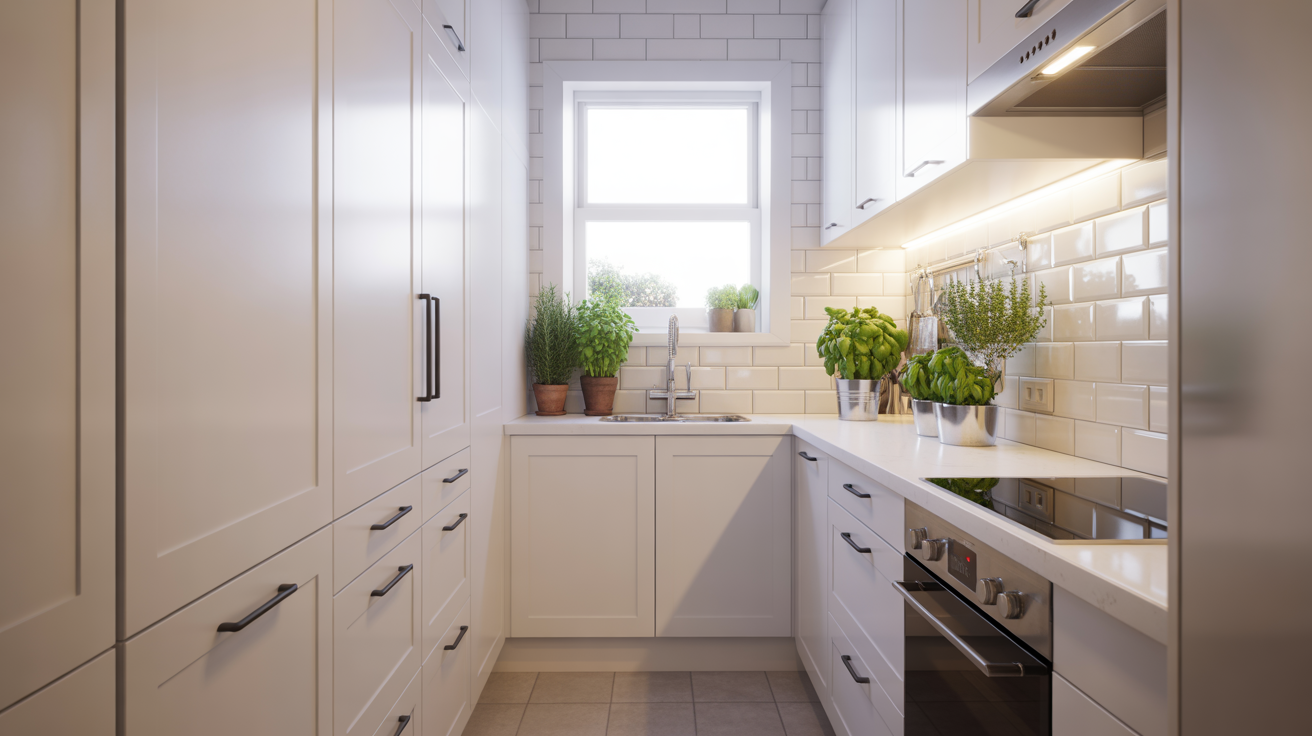 Horizontal hardware visually widens narrow cooking spaces. Long pulls create a perception of expanded dimension while providing practical operation in space-constrained kitchen layouts.