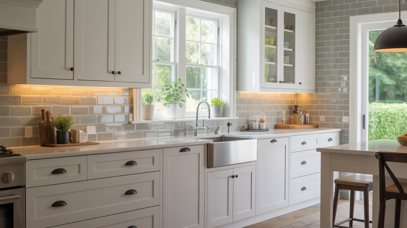 Classic white tile arrangements complement traditional cabinet styling. Black hardware complements these lasting design elements, creating a kitchen look that remains fresh and refined over time.