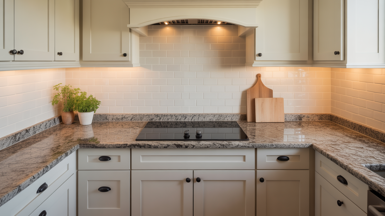 The soft white cabinets pair beautifully with speckled granite countertops. This clean and cozy setup brings warmth and texture without feeling too busy or dark.
