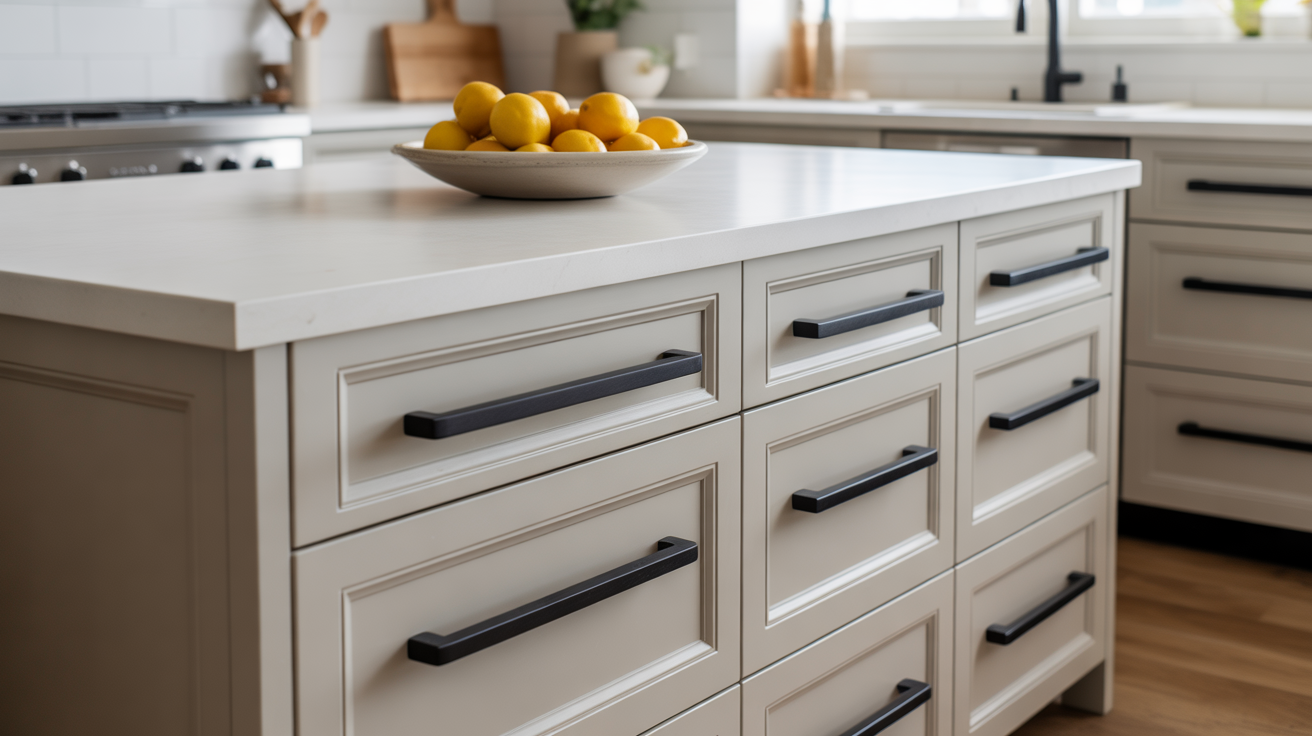 Statement hardware on central islands creates visual anchor points. Large-scale pulls convert functional elements into deliberate design features that draw attention to the kitchen’s focal point.