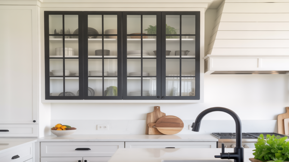 Black-framed glass uppers add a bold contrast to the white cabinetry. Paired with matching pulls and a black faucet, this look feels clean, structured, and well-balanced.