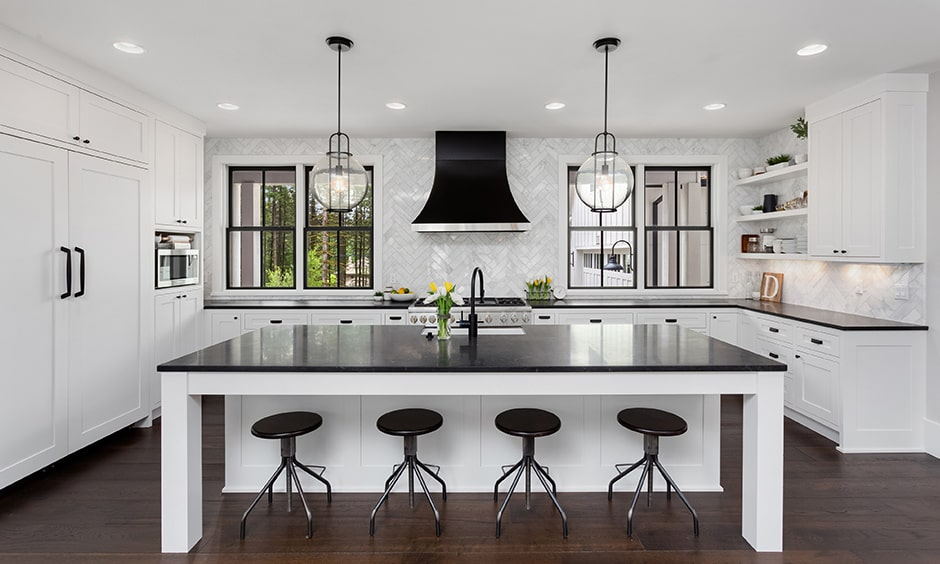 Complete your kitchen design with these complementary elements that enhance the classic white and black foundation.