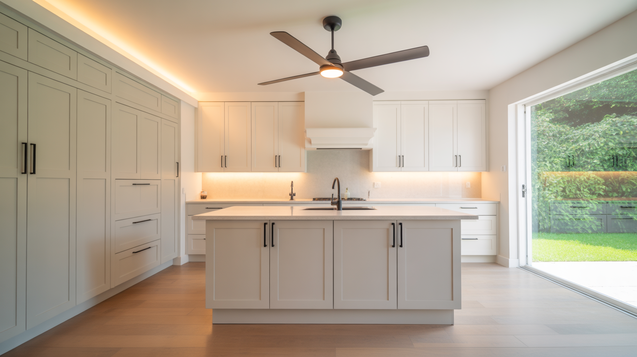 The fan has sleek blades and hangs above the open cooking area, adding contrast and airflow. The space includes light wood flooring, minimal black cabinet handles, and soft natural lighting.