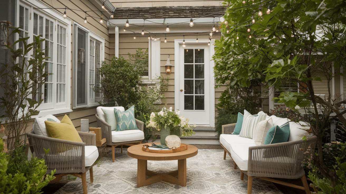 Create a cozy outdoor retreat with comfortable seating, string lights, and rustic outdoor furniture.
