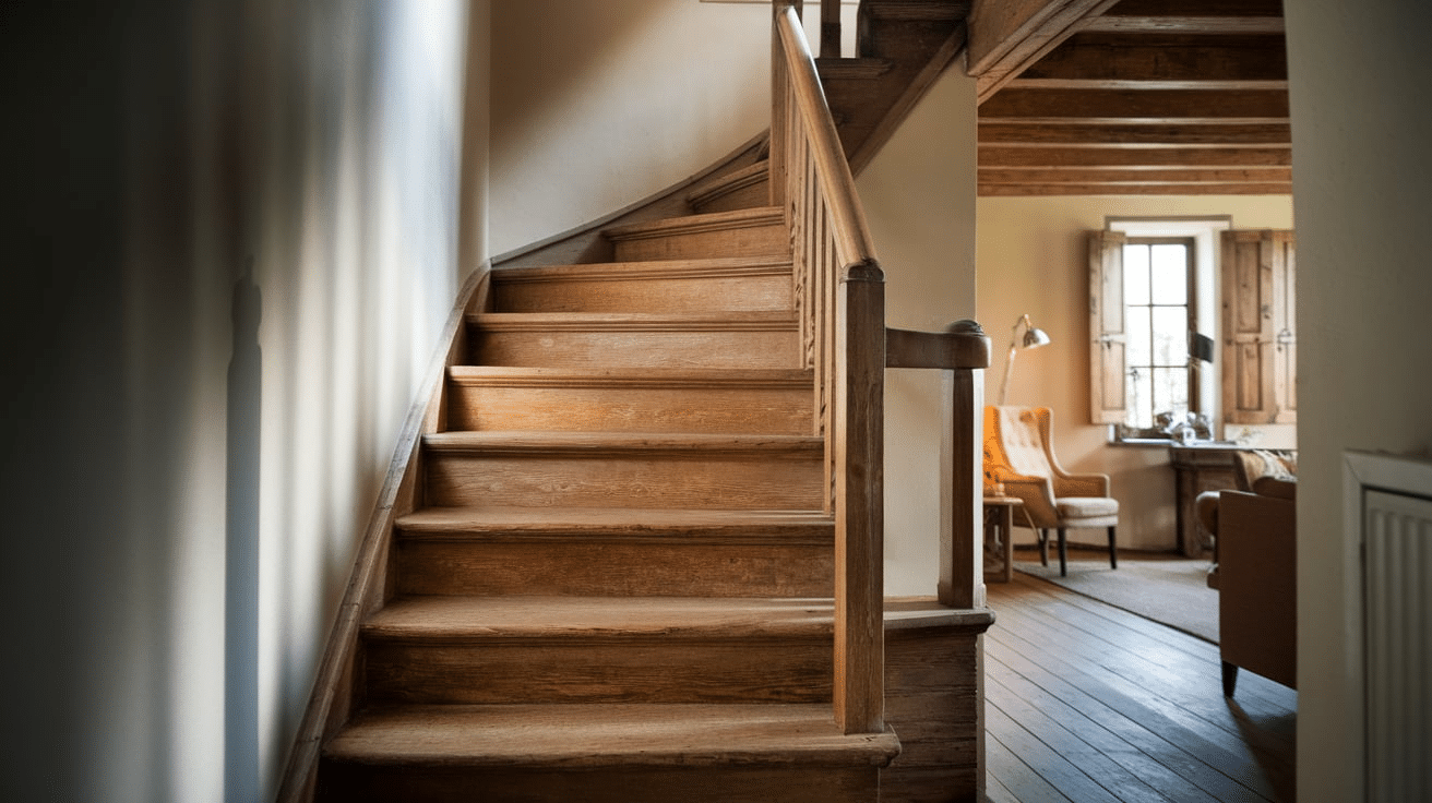 Wooden staircases have a timeless beauty that perfectly complements the rustic style of an old cottage house.
