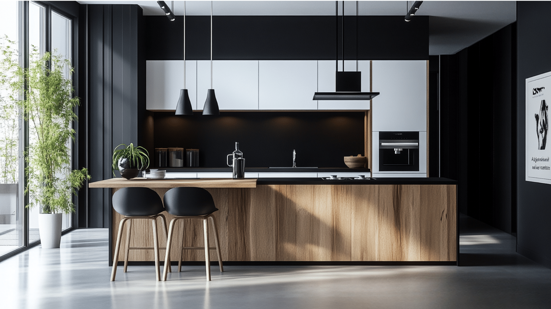 Paint the lower cabinets black while keeping the uppers white or wood. Add black metal light fixtures and handles.