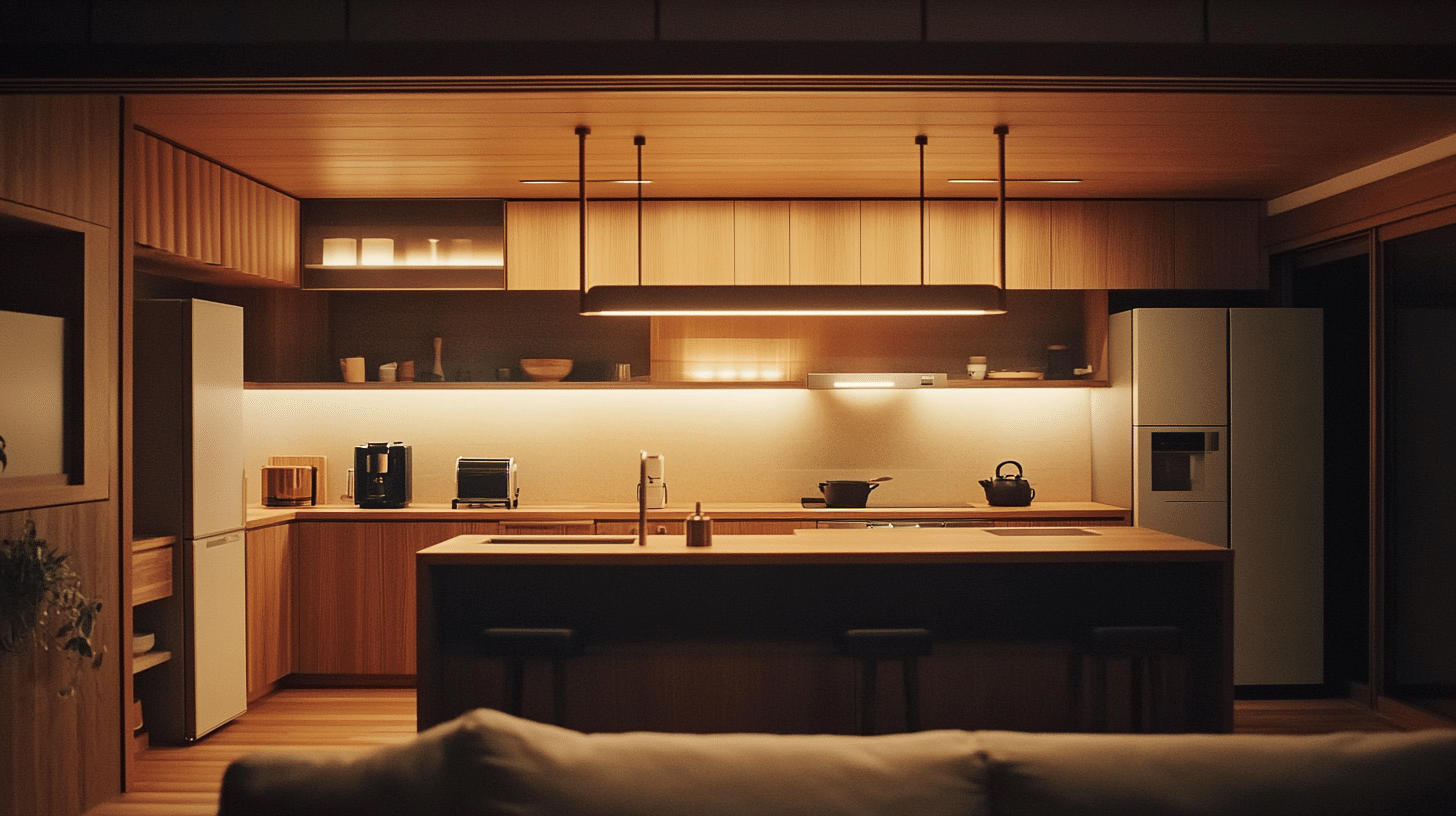 This creates warm and cool spots in the kitchen, making it feel cozy at night while still giving enough light for cooking tasks.