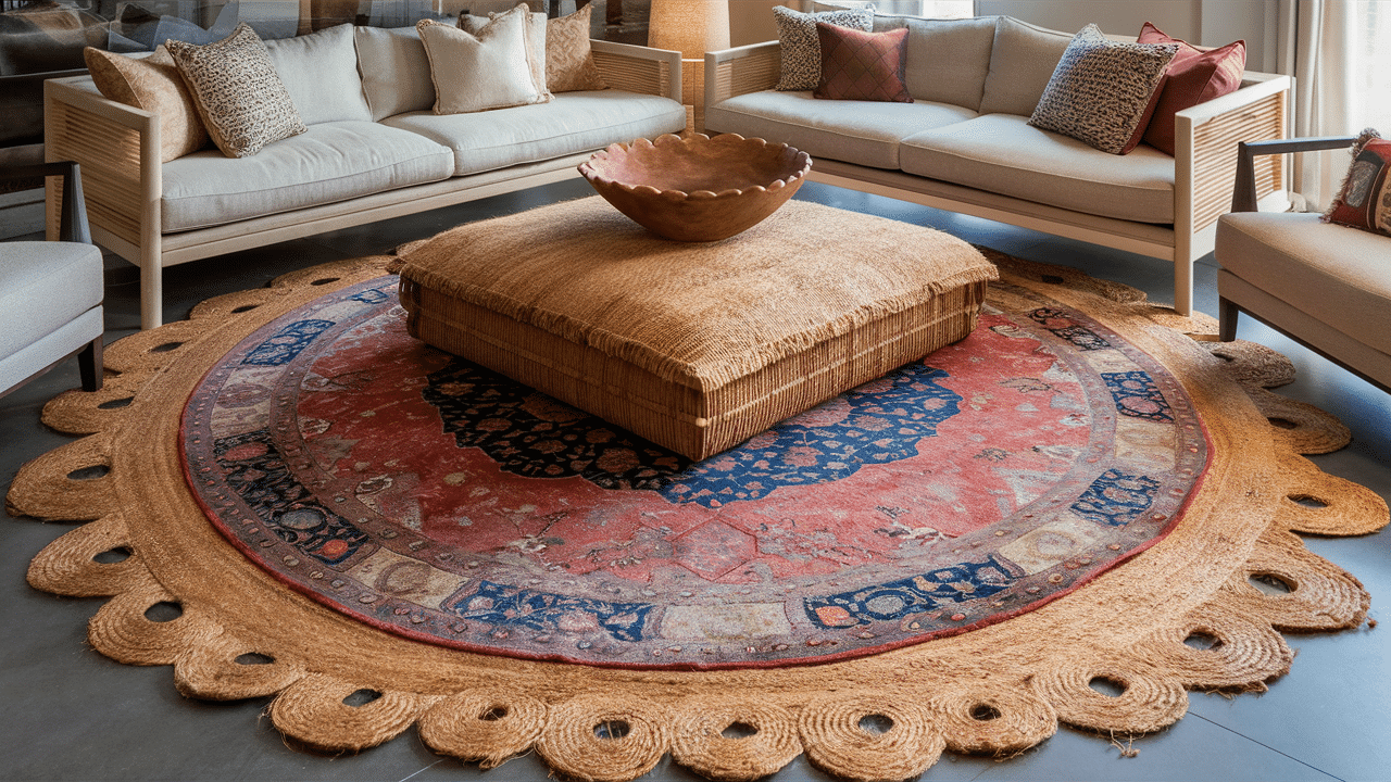 - Best combinations: Jute + vintage rug, flatweave + shag rug.