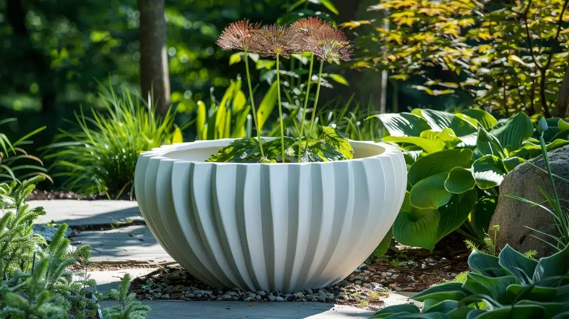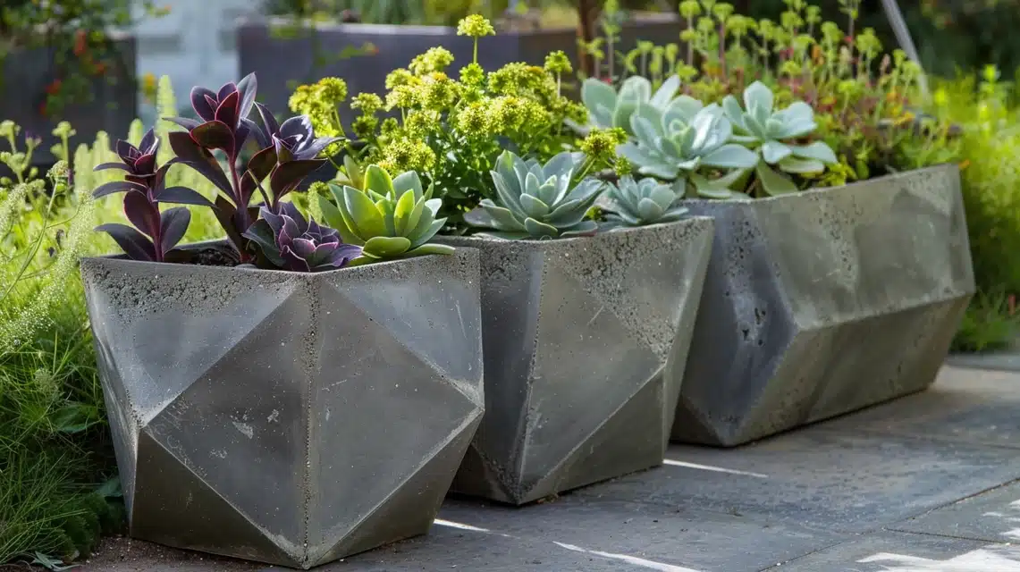 Faux concrete planters are decorative containers that look like they’re made of concrete but are crafted from lighter, less expensive materials.