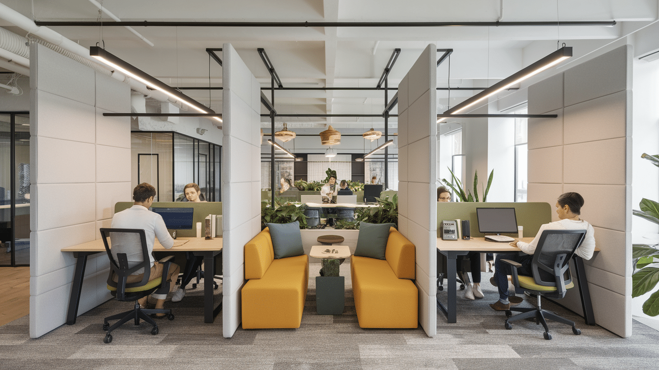 Comfy chairs and good sound control help people work together for longer periods. These areas often sit between work zones, making quick meetings easy.