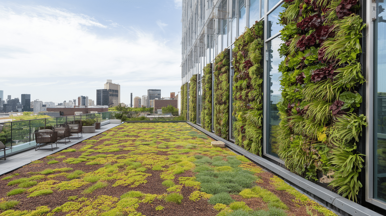 Plants now grow on building tops and walls, not just around them. These green spots help clean the air and keep buildings cooler in the summer.