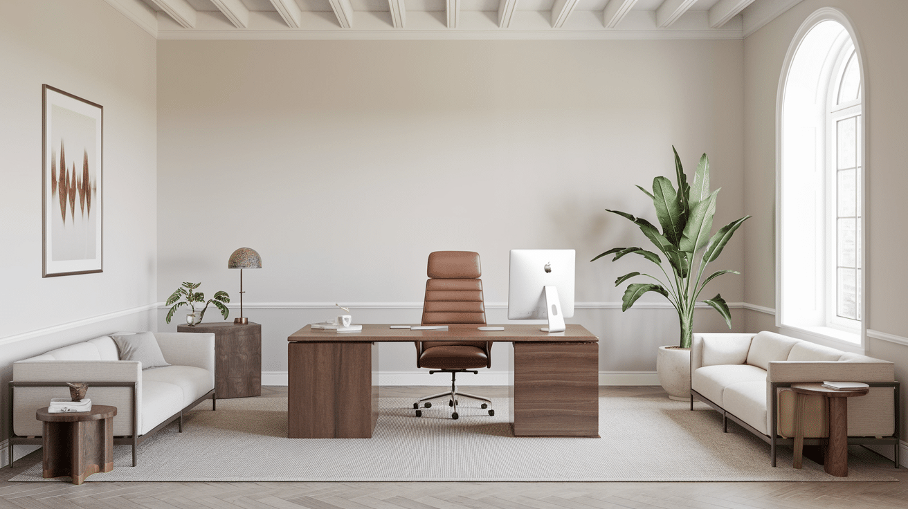 Office insides now focus on clean looks with less stuff. Desks stay clear, and storage keeps items out of sight. Colors are often soft and calm, with just a few bright spots for interest.