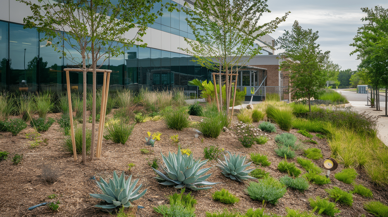 The plants around new buildings are picked to need less care and water. Native plants that grow well in the local weather are best. Water systems use sensors to run only when needed, not on a fixed schedule.