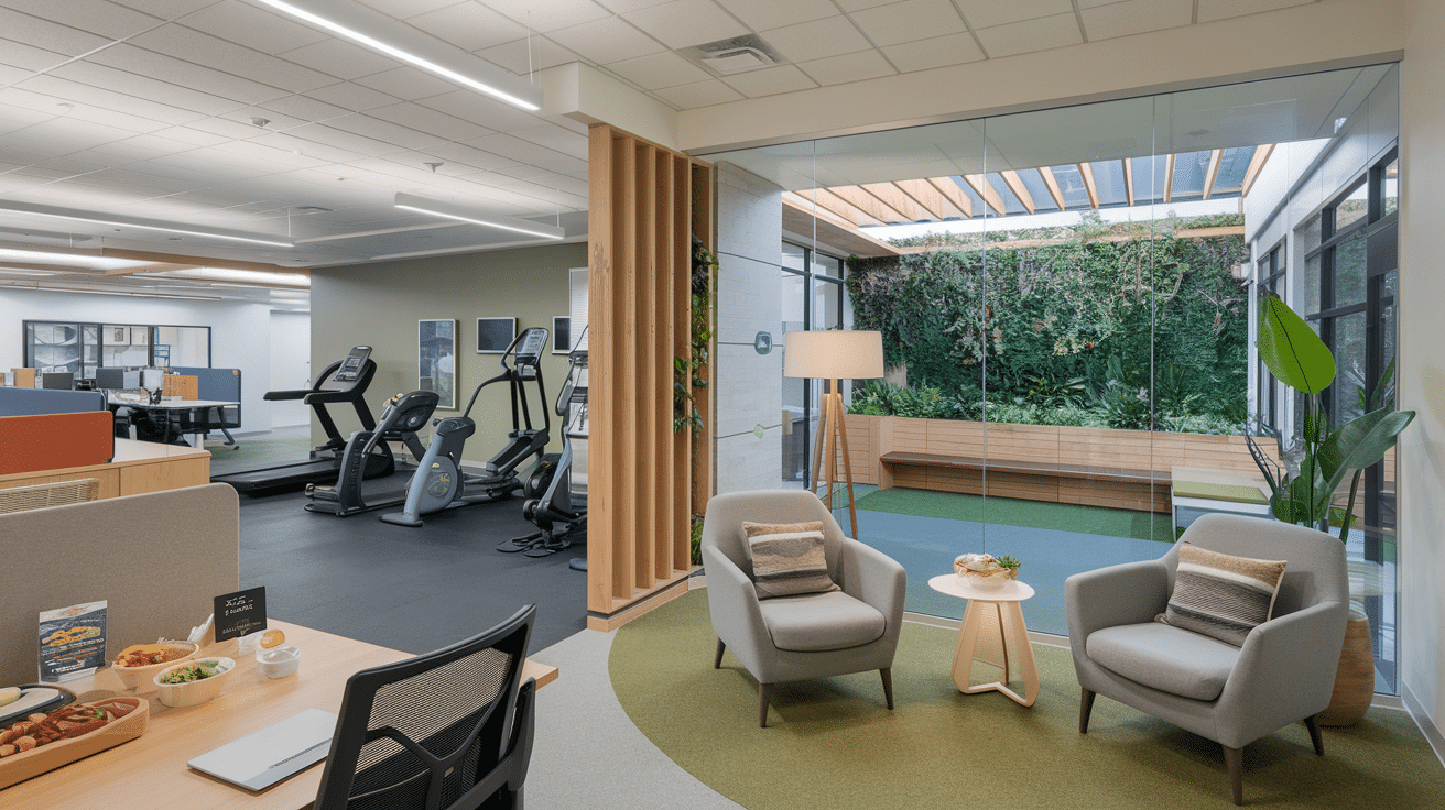 Office buildings now include spaces that help keep workers healthy. These might be gyms, quiet rooms for rest, or outdoor areas for fresh air.