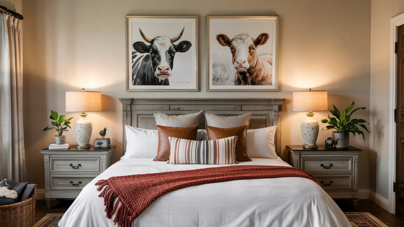 Farmhouse bedrooms and farm animals go together. It’s a natural fit! A framed print of a cow, sheep, or chicken brings a bit of countryside feel without feeling childish. Look for soft watercolors or black-and-white sketches.