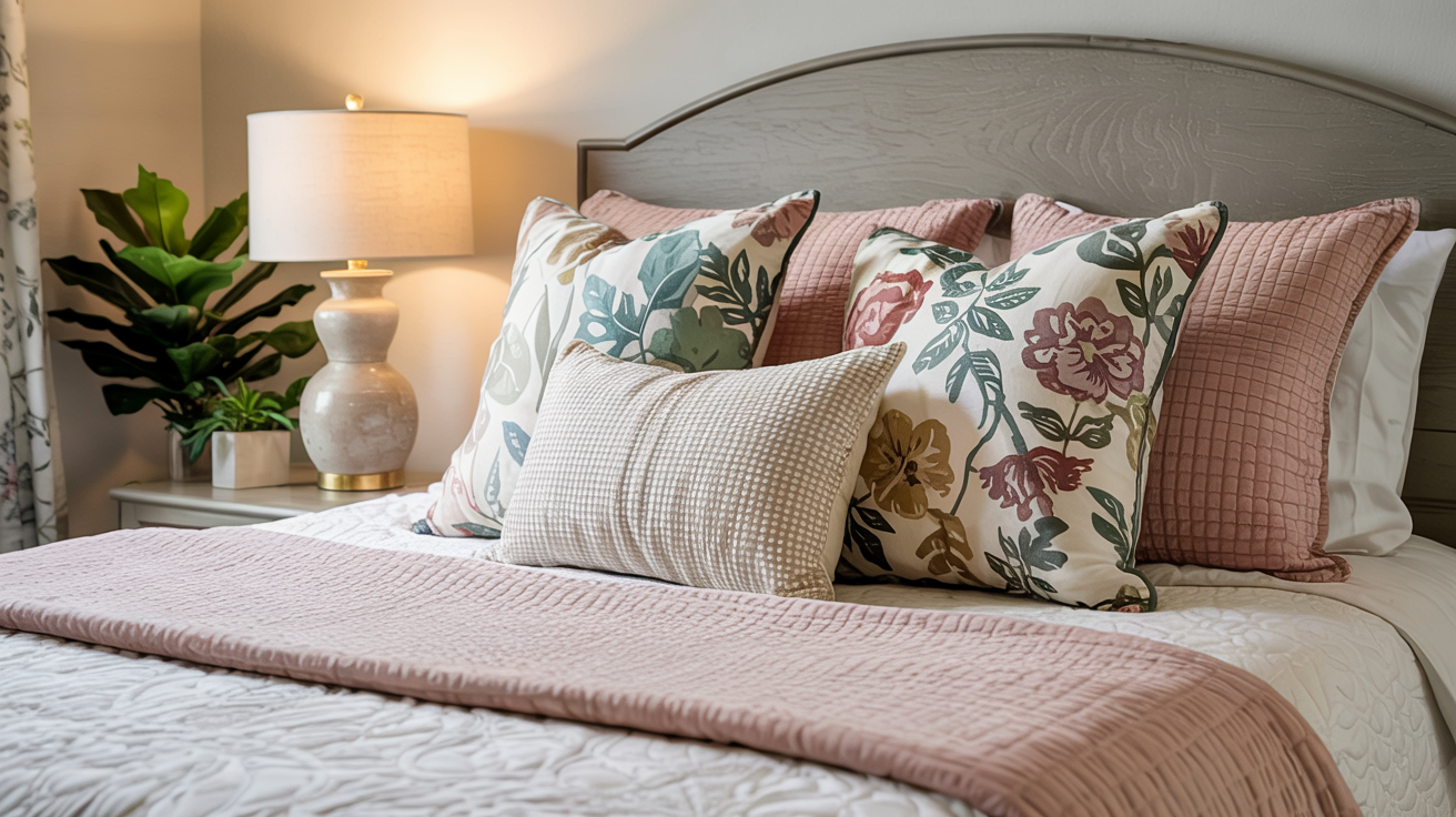 Floral pillows are a lovely way to add a soft touch to your bed. I like using ones with small prints in soft shades, think dusty rose, sage green, or muted blue.