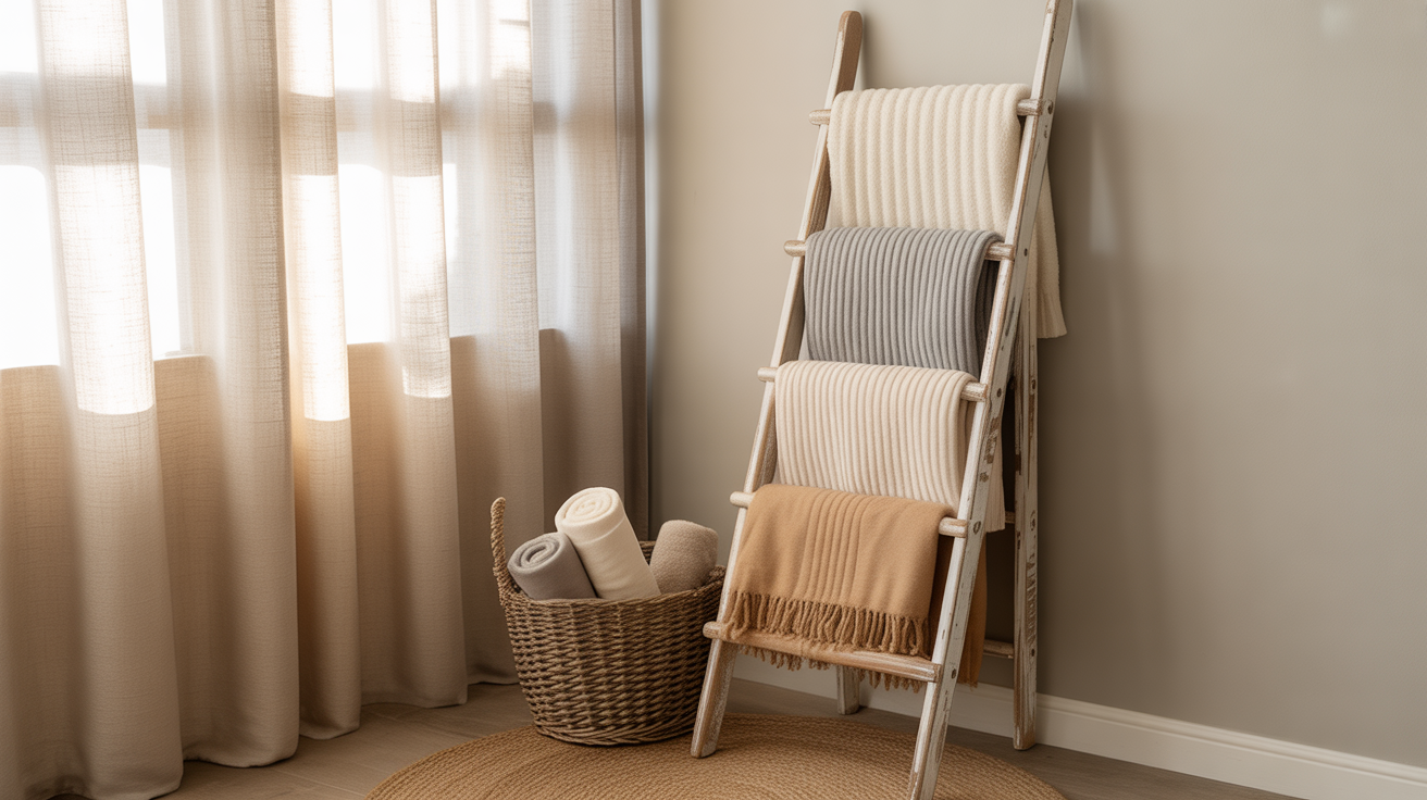 A wooden ladder leaning against the wall is an adorable way to store and display blankets. It adds height and interest without taking up much space.