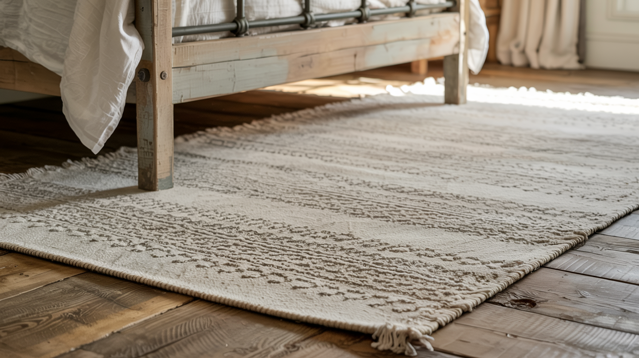 Adding a soft rug under your bed makes the whole room feel cozier. I love using neutral rugs, such as those in beige, off-white, or light gray.