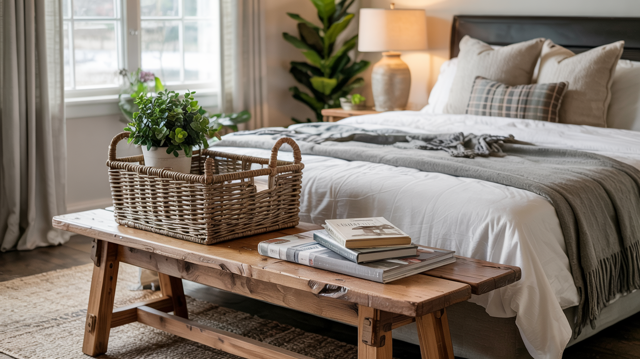 Try adding a wooden bench or vintage chest at the foot of the bed. It brings character and function without cluttering your space.