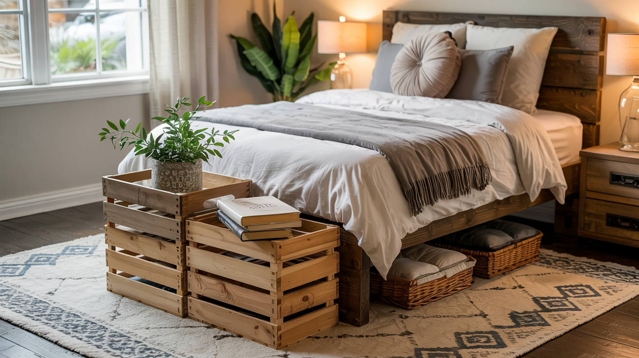 Wooden crates are my go-to choice when I want to keep things tidy without sacrificing the rustic style. They’re perfect for storing extra blankets, books, or even slippers at the end of the day. Just slide them under a bench or beside the bed.