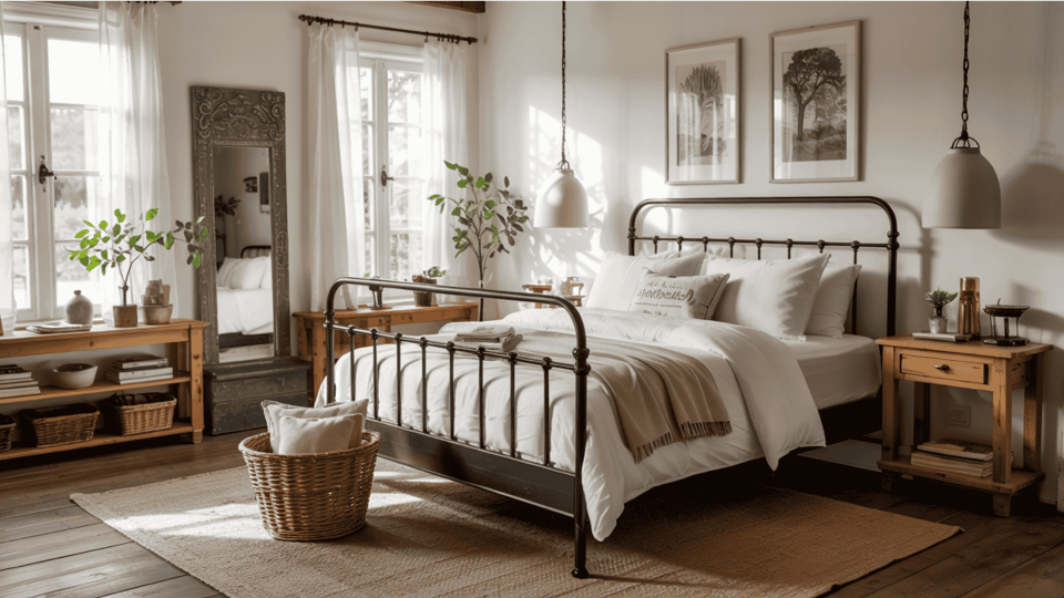 Rustic pieces bring character, think old-style dressers or vintage-look mirrors. Modern touches like neat light fixtures or open space keep the room feeling fresh.