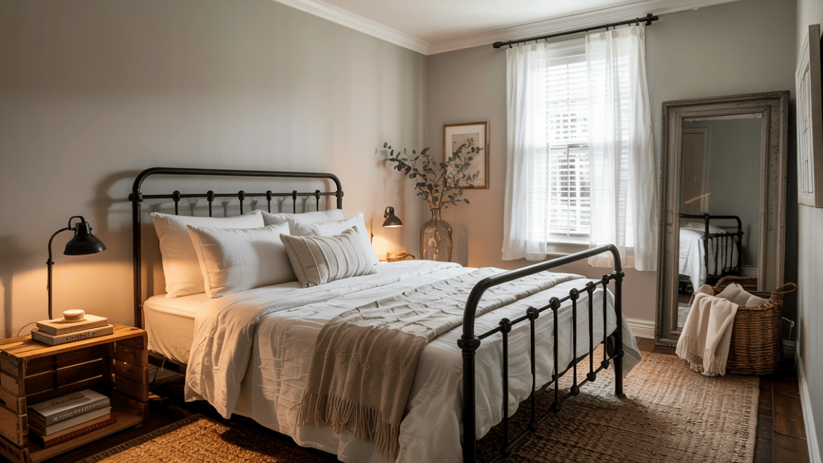 If you want something classic that ties the room together, a wrought iron bed frame is perfect. The dark metal contrasts with light walls, giving your room an old-fashioned farmhouse feel.