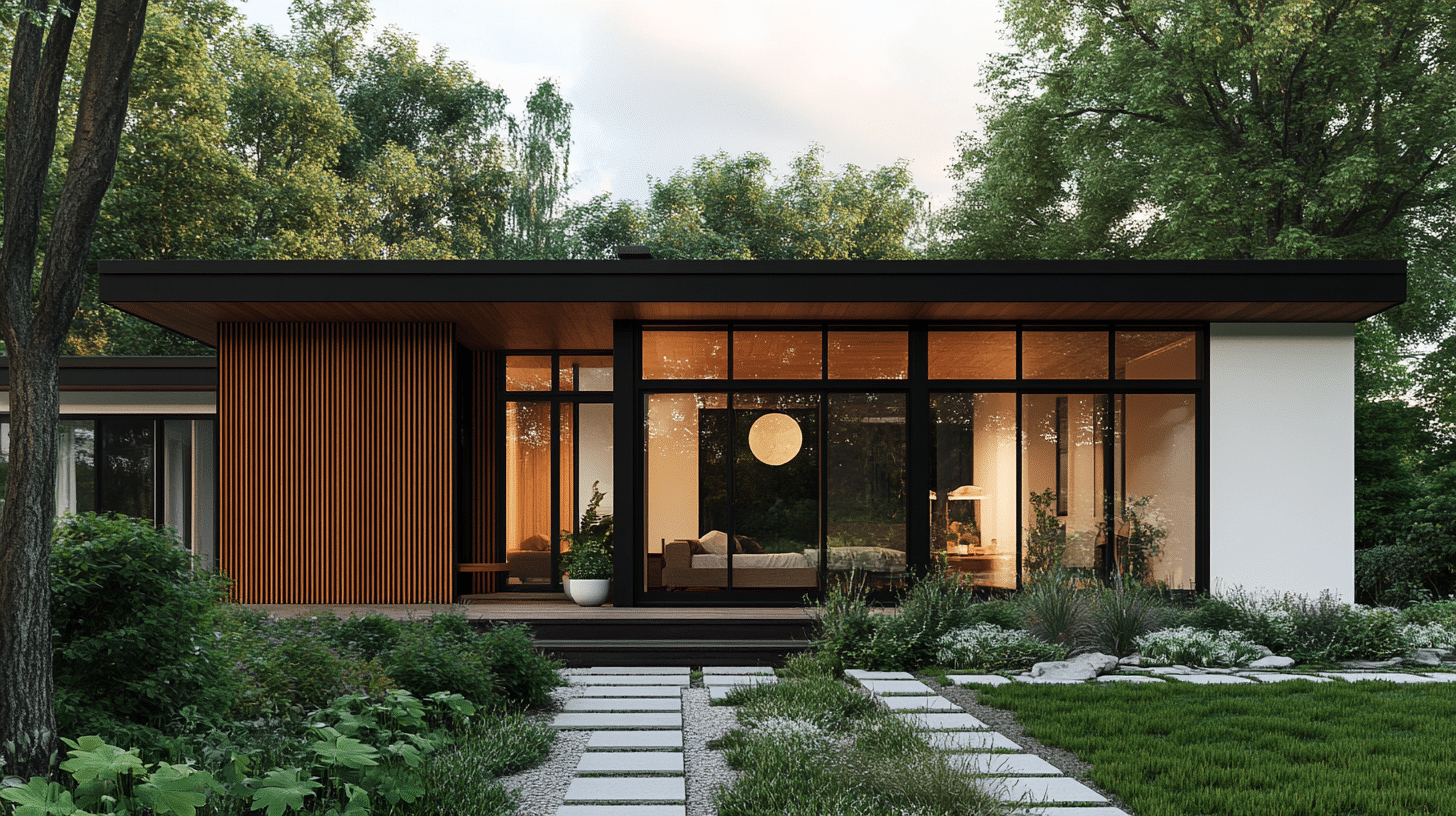 - A sleek, black-painted exterior gives the house a modern, sophisticated look