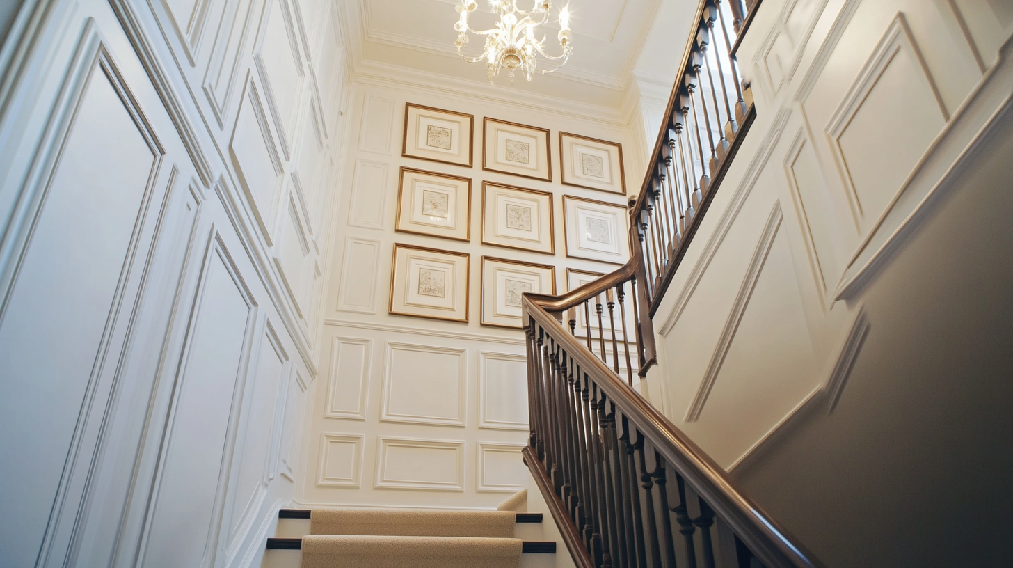 Picture frame molding uses strips of wood to create box shapes on walls. This style adds a classic, high-end look to formal homes and grand staircases.