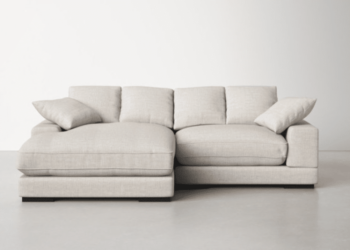 If you are looking for a cloud couch dupe, this Castlery Hamilton Chaise Sectional Sofa is great for bigger spaces. With a sleek and minimalistic aesthetic, this L-shaped sectional sofa has deep seats. Plus, they come with additional cushions that ensure great comfort and give a very expensive look. In terms of comfort, this sofa sits on a middle range, which means that seats are soft enough for you to feel comfortable, but you might not get the sinking feeling.