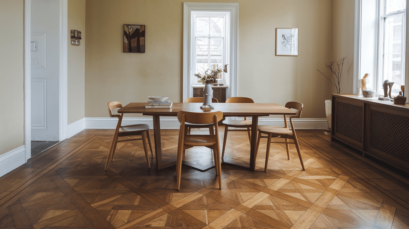 Parquet flooring is made from small pieces of wood arranged in geometric patterns, like squares or diamonds. It’s a unique and detailed pattern that works well in formal spaces or rooms where you want to add extra style.