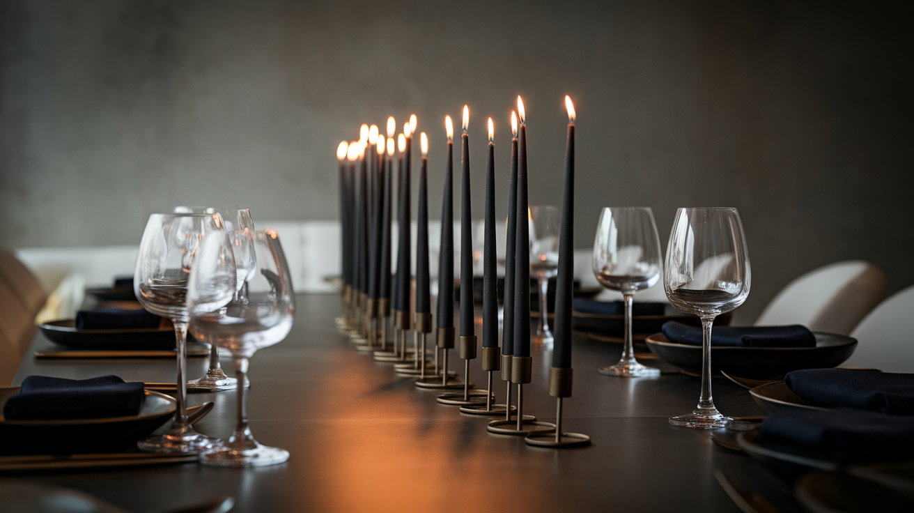 For a look that’s both classic and current, arrange 3-5 slim black taper candles in a row down your table. Choose simple holders in brass or matte black that sit low to the table.