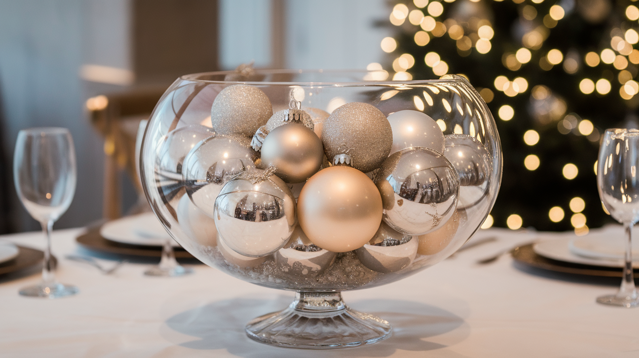 Create holiday sparkle with a simple glass bowl filled with shiny ornaments. Mix silver and gold balls for a classic look, or choose colors that match your home’s holiday theme.