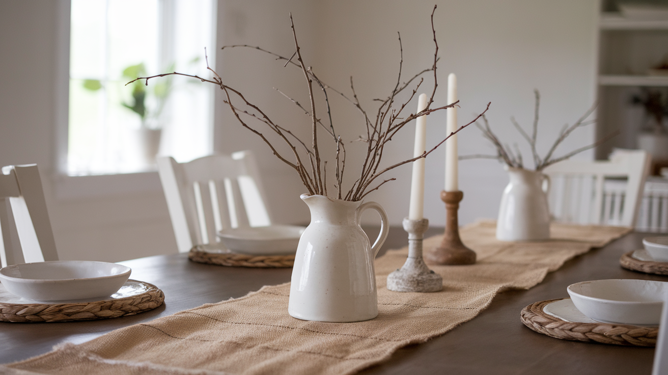 Start with a textured burlap runner down the middle of your table. Add a simple white or cream ceramic pitcher for contrast.