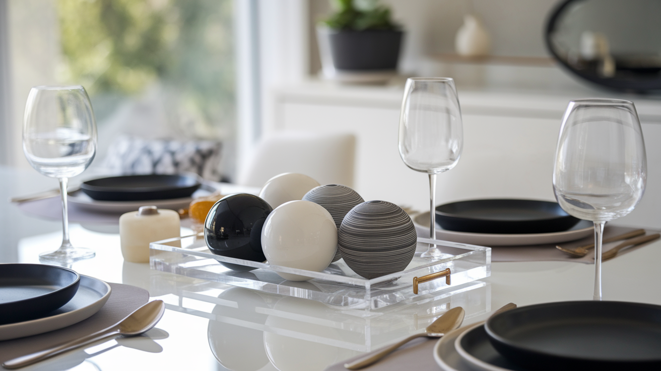 The clear tray seems to float on your table, while the monochrome objects create subtle interest without visual clutter. This option works well in small dining spaces where you want to keep the table feeling open.