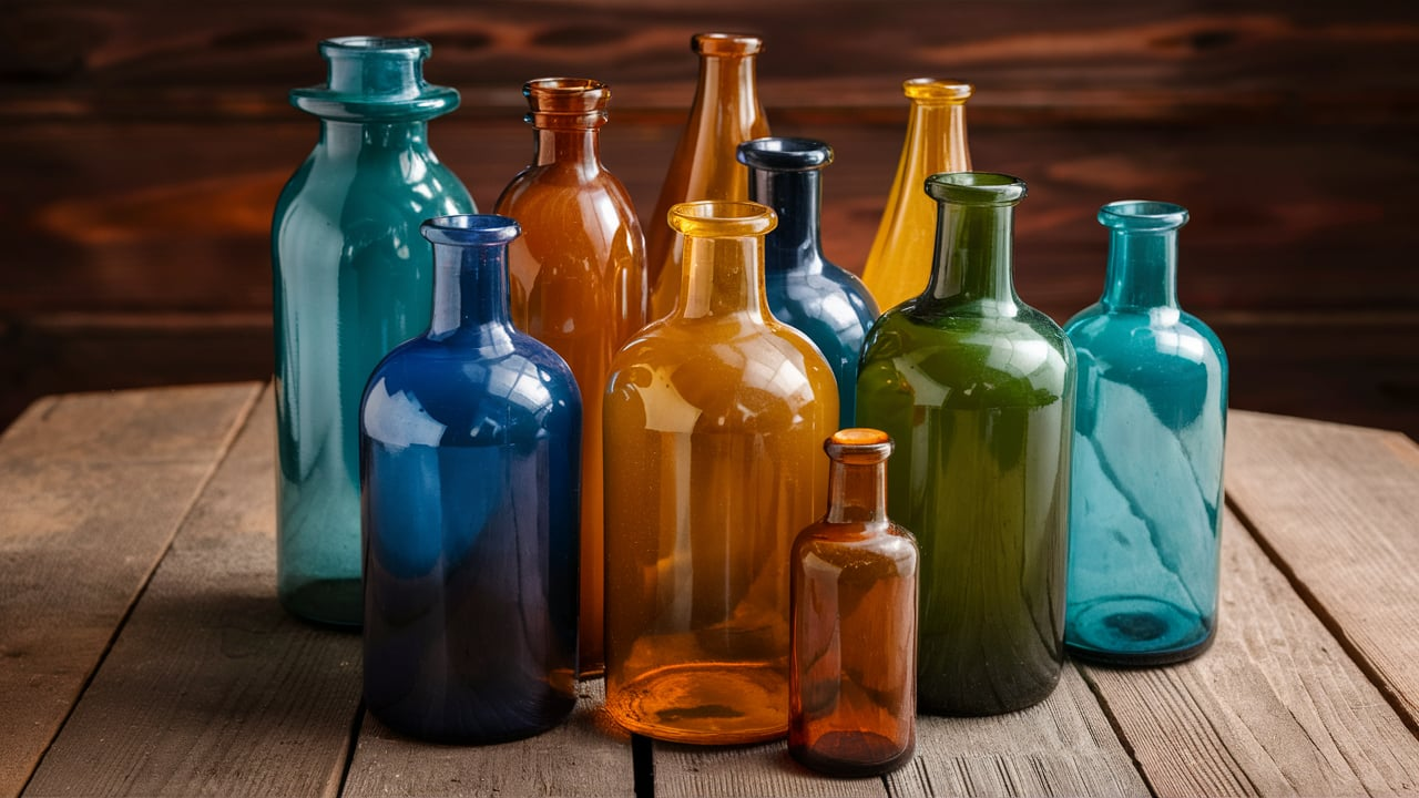 Create a casual but striking grouping with vintage glass bottles in bold colors like cobalt blue, amber, and green. Look for interesting shapes and sizes that work well together despite their differences.