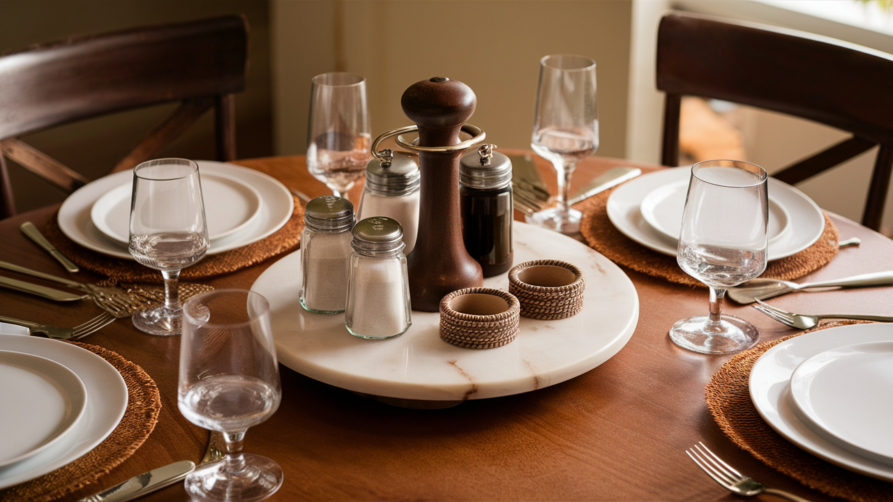 A rotating lazy Susan in wood or marble forms the perfect centerpiece that serves a clear purpose. Place small salt and pepper cellars, napkin rings, or sauce dishes around the edges within easy reach for everyone at the table.