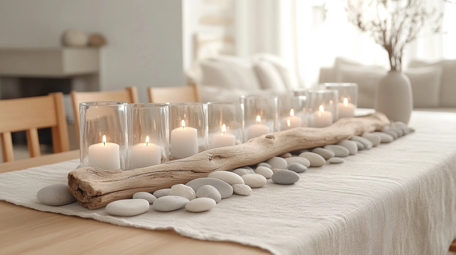 Create a low-profile centerpiece with a piece of smooth driftwood set on a linen runner. Scatter white or gray pebbles around it, and nestle in a few tealight candles for the glow.