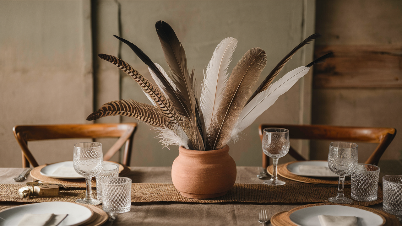 The contrast between the earthy container and the airy feathers creates visual balance. This arrangement has a casual, collected-over-time quality that fits perfectly with boho style. The feathers add height without blocking sight lines across the table.