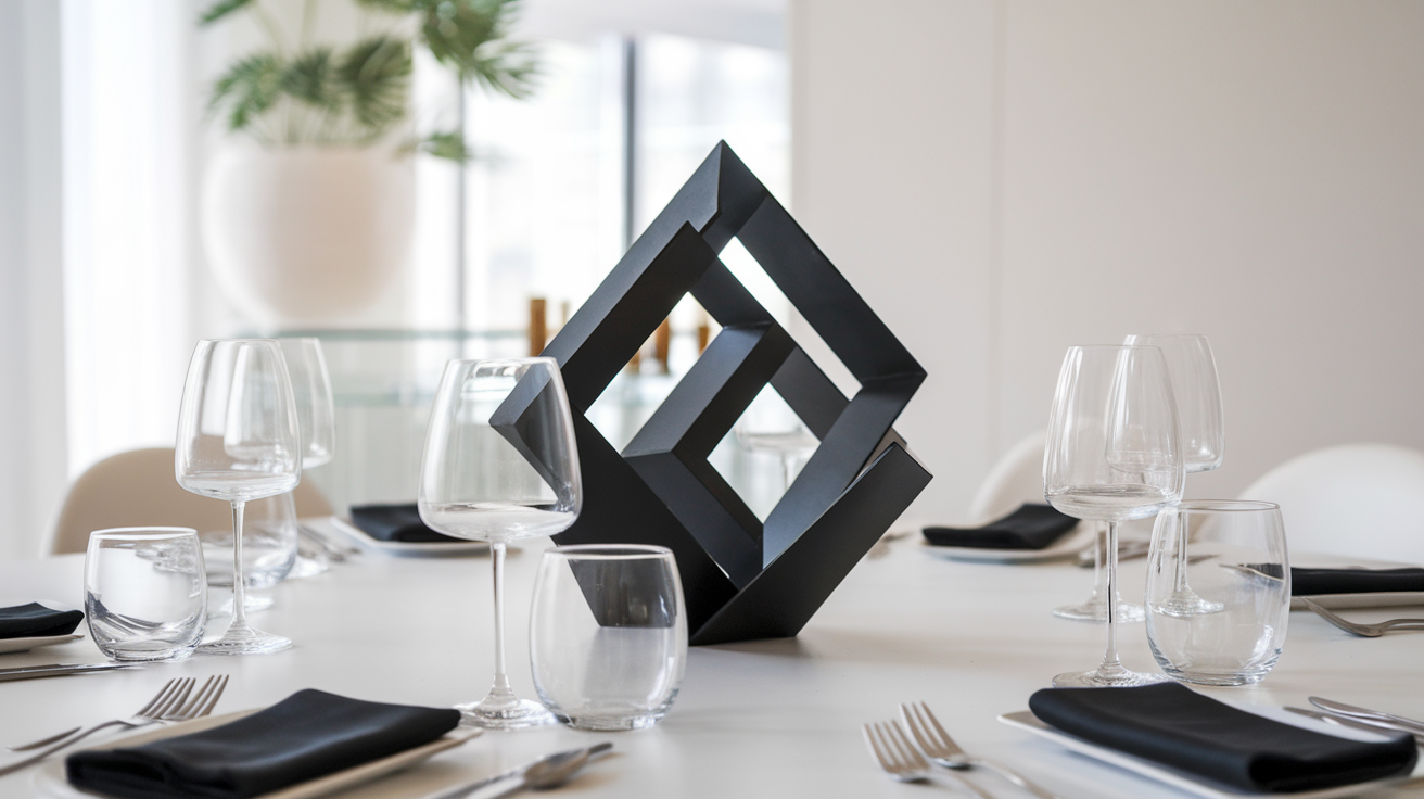 A single metal sculpture with clean angles and geometric shapes makes a bold statement on your dining table. Choose black for drama or gold for a touch of warmth that still feels current.