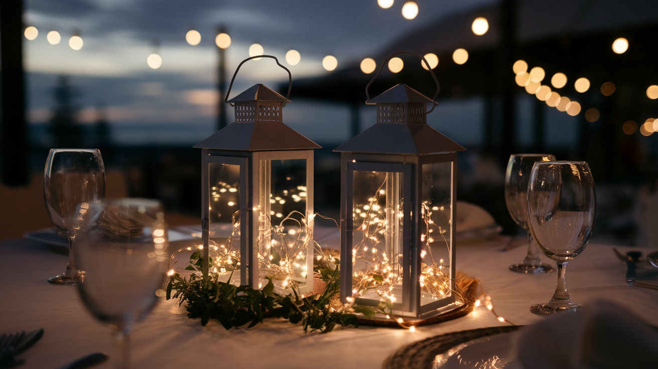 For a centerpiece that creates mood any time of year, place one or two lanterns in the middle of your table. Fill them with battery-powered string lights that twinkle and glow.