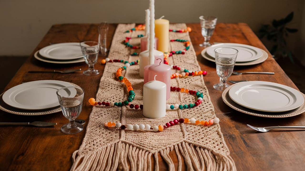 Start with a textured macrame table runner as your base layer. On top, arrange beaded garlands that snake across the fabric, adding color and shine.