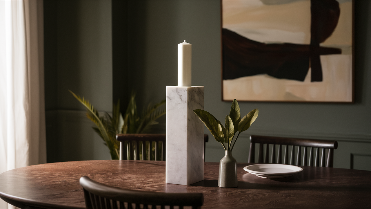 Sometimes simplicity makes the strongest statement. A single tall marble candle holder with a matching pillar candle creates a strong vertical line that feels both grounded and graceful.