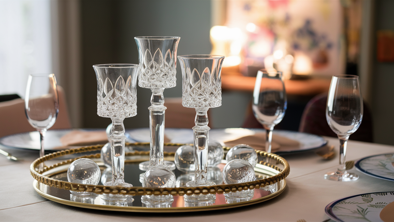 For a touch of luxury, start with a mirrored tray as your base. On top, arrange a few crystal elements like small spheres, cut glass votives, or a crystal bowl.