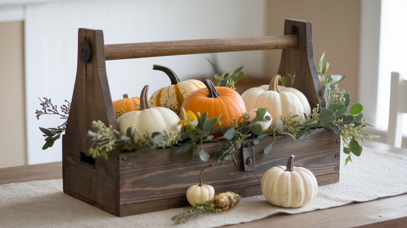 Find an aged wooden toolbox or crate and place it at the center of your table. This versatile container can hold a variety of items throughout the year—candles and greenery in winter, small pumpkins in the fall, or decorative balls for a splash of color.