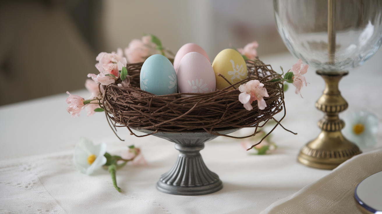 Place the nest on a simple pedestal plate or cake stand to give it height and importance. This sweet display works well from Easter through early summer and stores compactly until next year.