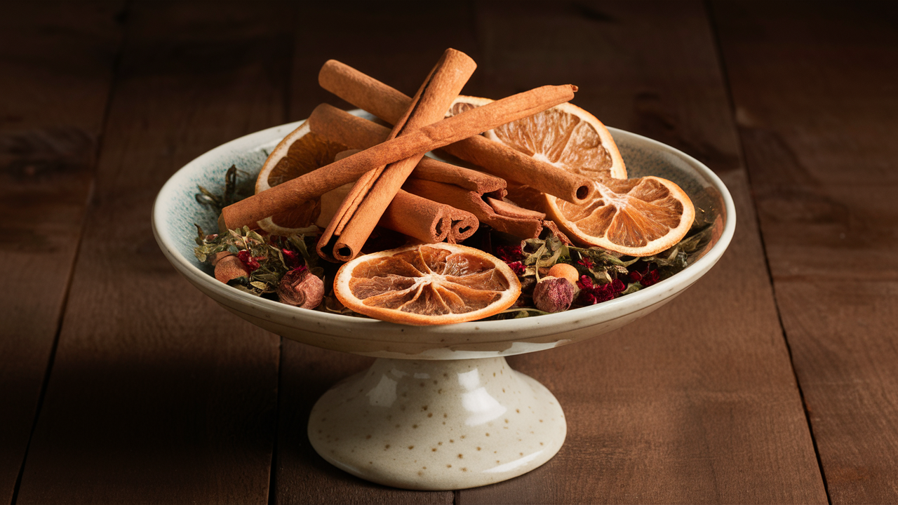 A raised stone or ceramic bowl creates height and importance at your table’s center. Fill it with fragrant dried items like cinnamon sticks, dried orange slices, or scented potpourri.
