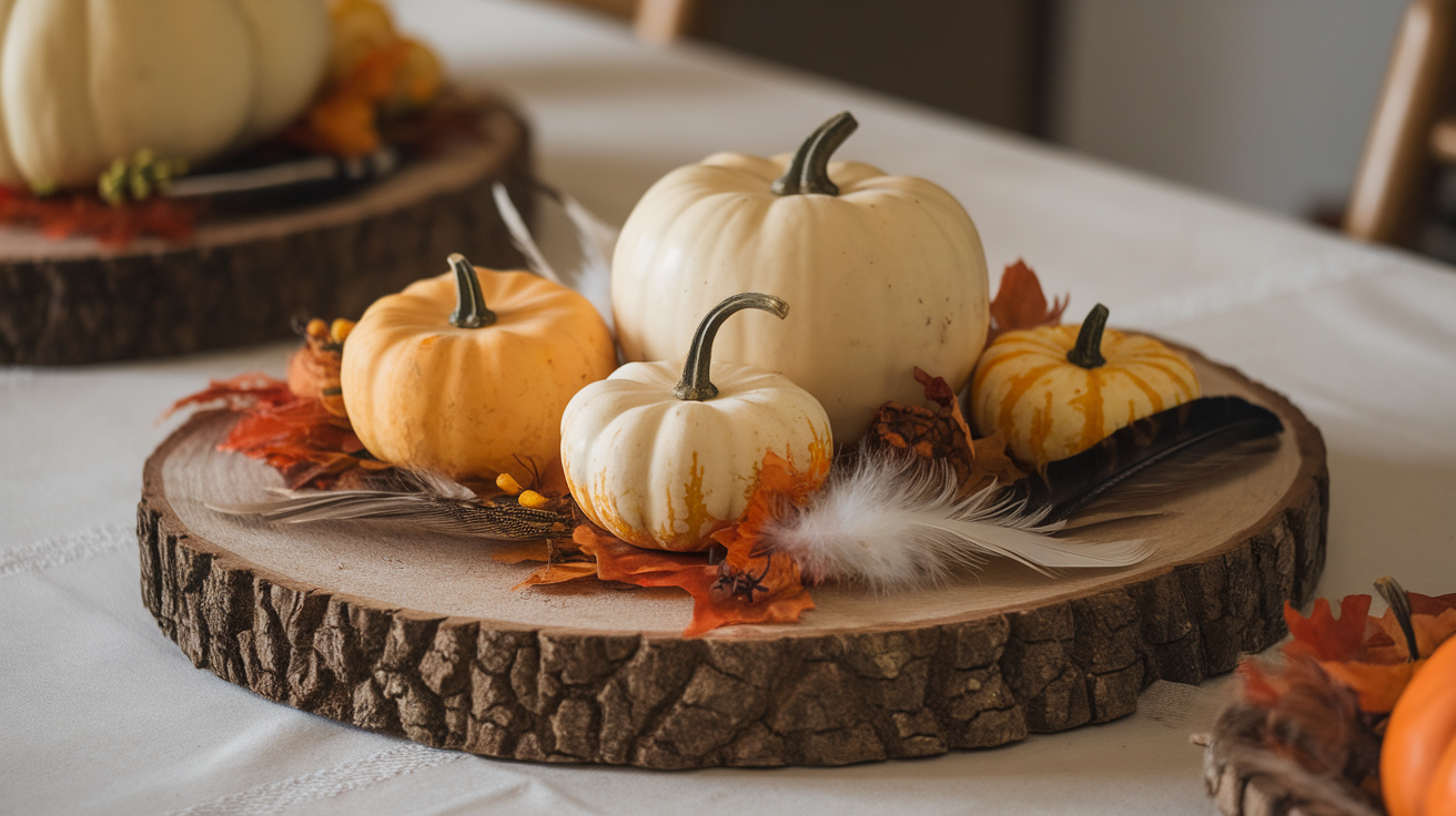 When leaves start to change, bring those warm colors to your table. Start with a round wood slice as your base, then arrange small pumpkins in various sizes across it. Add a few feathers and dried leaves between the pumpkins for texture and color variation.