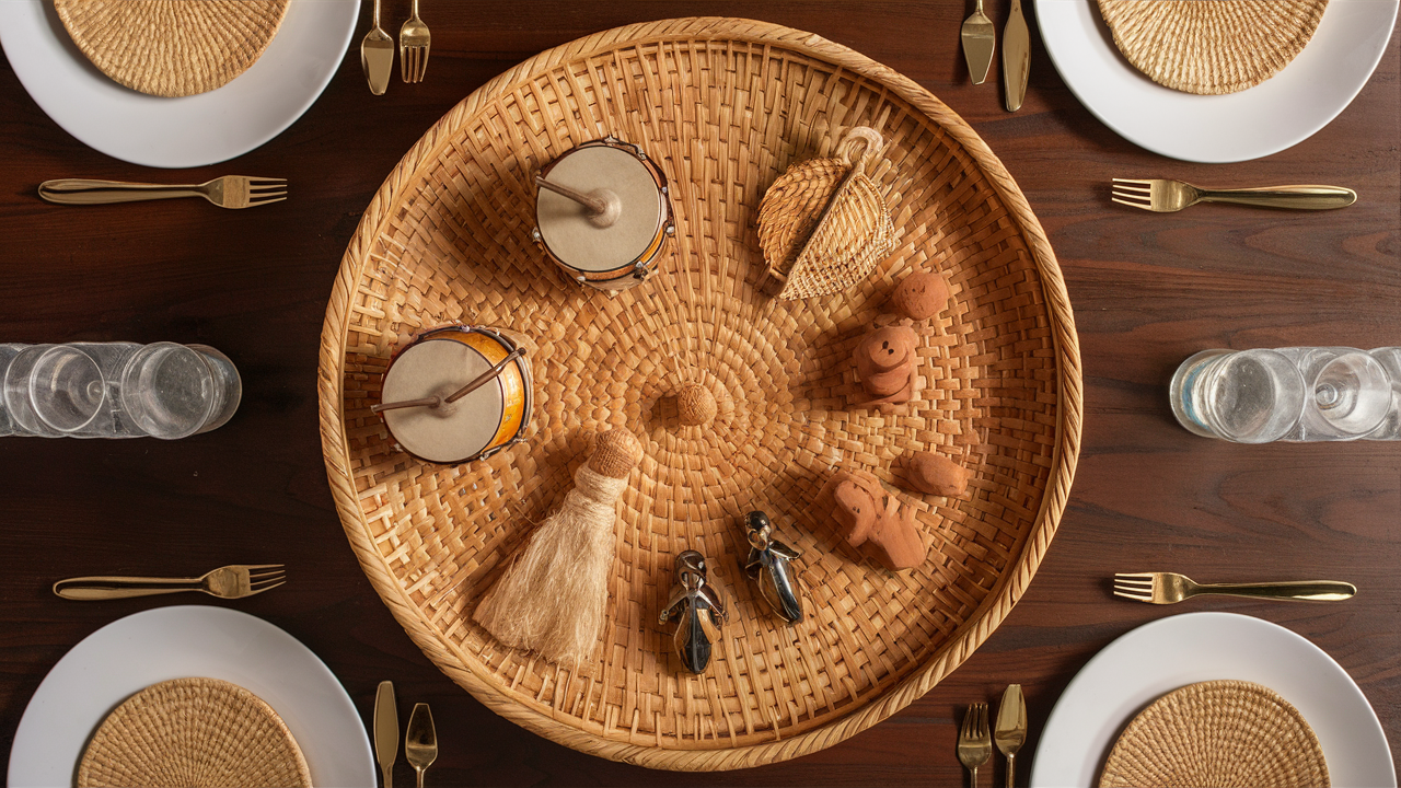 Tell your travel stories through your table decor. Place a woven rattan tray at the center of your table and fill it with small items collected from different places—miniature drums, hand-painted boxes, small woven fans, or clay figures.